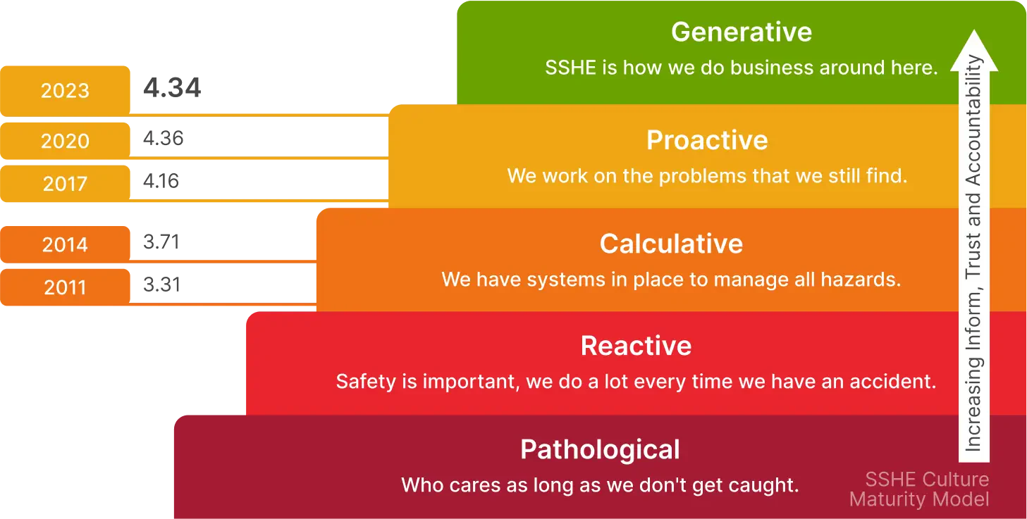 The SSHE culture maturity level of the entire organization increased to 4.34 (Proactive level) based on the 2023 SSHE culture survey results, with no distinction between the results of top management and employees. Regardless of position, all PTTEP employees have the same level of SSHE awareness. In addition, mode 1 contractors were initially engaged in the SSHE culture survey in 2020. PTTEP expanded the scope of the SSHE culture improvement and development technique in 2022 to include mode 2 contractors performing high-risk activities, as detailed in the contractor safety topic.
